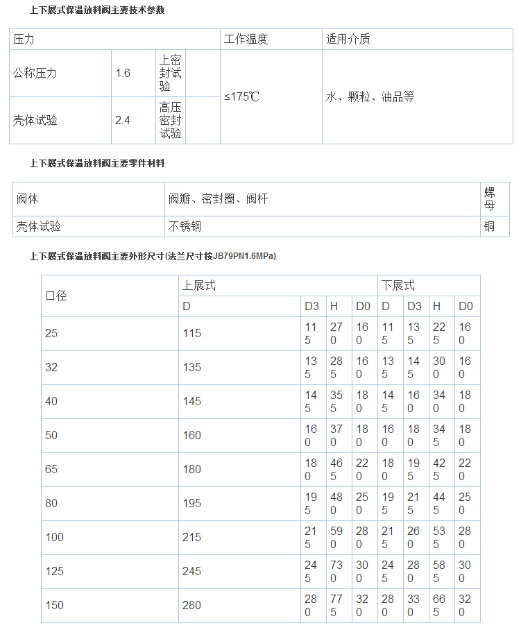 上下展式保温放料阀主要尺寸表