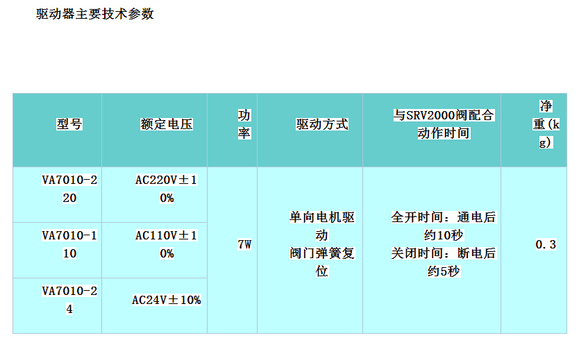 VA7010系列开关式电动阀由VAA7010系列阀门驱动器和VAV7010系列铜阀组成。用于控制冷水或热水空调系统管道的开启或关闭,达到控制室温之目的。驱动器由单向磁滞同步电机驱动,阀门弹簧复位。阀门不工作时处于常闭状态,当需要工作时,由温控器提供一个开启信号,使电动阀接通交流电源而动作,开启阀门,冷冻水或热水进入风机盘管,为房间提供冷气或暖气;当室温达到温控器设定值时,温控器令电动阀断电,复位弹簧使阀门关闭,从而截断进入风机盘管的水流。通过阀门关