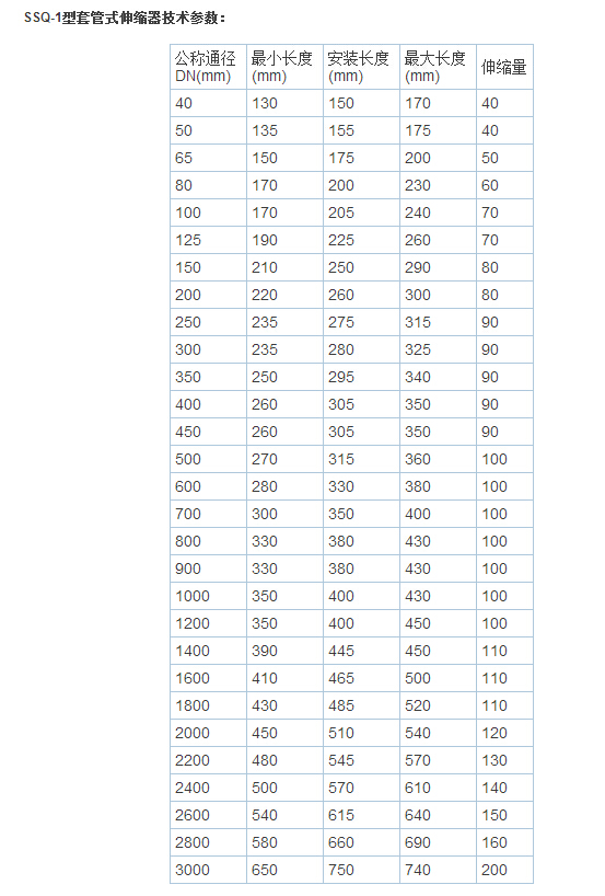 套管式伸缩器也称伸缩节、膨胀节、补偿器。套管式伸缩器在一定范围内可轴向伸缩,也能在一定的角度内克服管道对接不同轴向而产生的偏移,能极大的方便阀门管道的安装与拆卸,在管道允许伸缩量中可以自由伸缩,一旦越过其最大伸缩量就起到限位的作用,确保管道的安全运行。