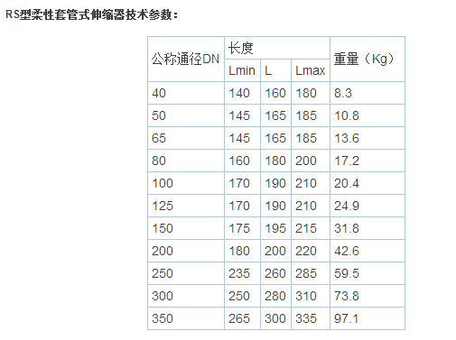 RS型柔性套管式伸缩器描述: 1. RS型柔性套管式伸缩器解决了原套管式伸缩器不产生偏角的问题,本产品最大偏角可达5.85度; 2. 表中长度数值,均系无偏角时的数值; 3. 本伸缩器由橡胶圈密封,伸缩器本身不能承受轴向拉力,一般将它安装在平直观点管道上。若靠近弯管或丁字管安装则应设置管道支墩,以免将伸缩器拉脱而漏水; 4. 本伸缩器中单盘短管可用外径的铸铁直管代替; 5. 法兰连接尺寸采用GB2555—81标准;