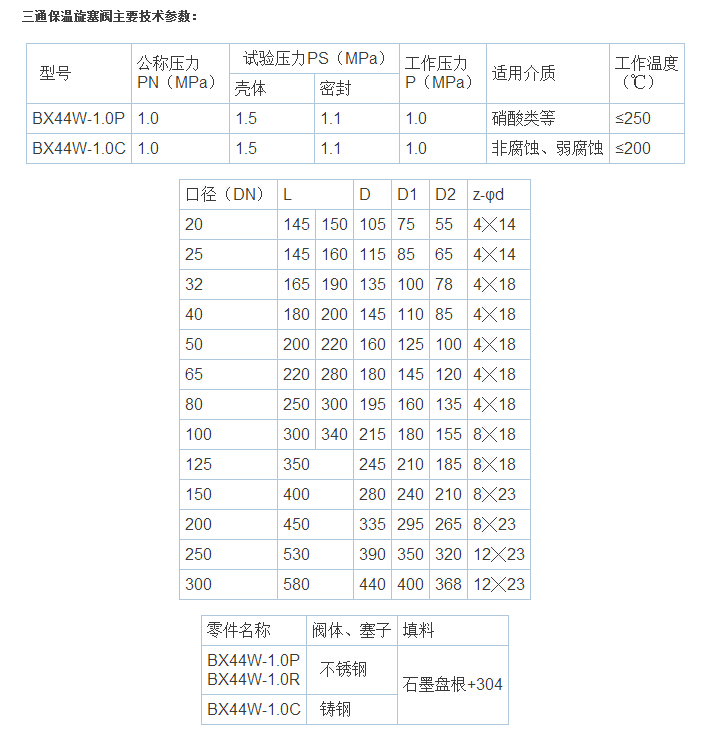 BX44W-1.0P/R/C型三通保温旋塞阀的启闭件是一个有孔的圆柱体,圆柱体与阀杆绕垂直于通道的轴线旋转,从而达到启闭通道的目的。主要供开启和关闭管道和设备介质之用