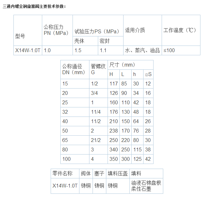 X44W-1.0T型三通内螺全铜旋塞阀的启闭件是一个有孔的圆柱体,圆柱体与阀杆绕垂直于通道的轴线旋转,从而达到启闭通道的目的。主要供开启和关闭管道和设备介质之用。该阀主要优点:适用于经常操作,启闭迅速、轻便。流体阻力小。结构简单,相对体积小,重量轻,便于维修。密封性能好,不受安装方向的限制,介质的流向可任意。无振动,噪声小。