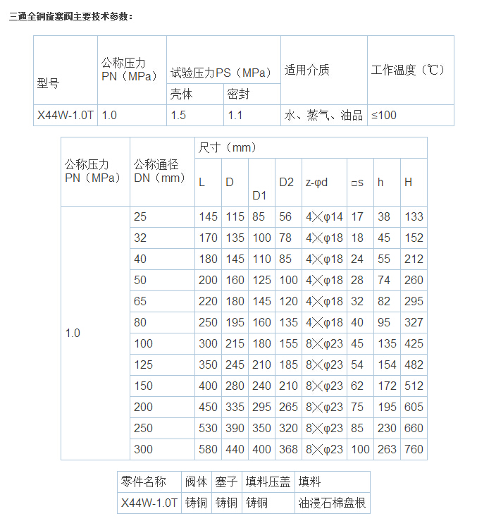 X44W-1.0T型三通全铜旋塞阀的启闭件是一个有孔的圆柱体,圆柱体与阀杆绕垂直于通道的轴线旋转,从而达到启闭通道的目的。主要供开启和关闭管道和设备介质之用。该阀主要优点:适用于经常操作,启闭迅速、轻便。流体阻力小。结构简单,相对体积小,重量轻,便于维修。密封性能好,不受安装方向的限制,介质的流向可任意。无振动,噪声小。