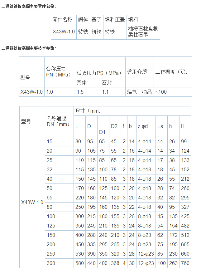二通铸铁旋塞阀性能参数: 手动、法兰连接、填料密封直通式结构,旋塞密封面材料为灰铸铁(X43W-10)、铸铜(X43T-10),公称压力 PN10、阀体材料为灰铸铁的旋塞阀。适用于工作压力小于 1.0MPa,温度低于 100℃ 的水、蒸汽、油品等介质的管路上作启闭用。