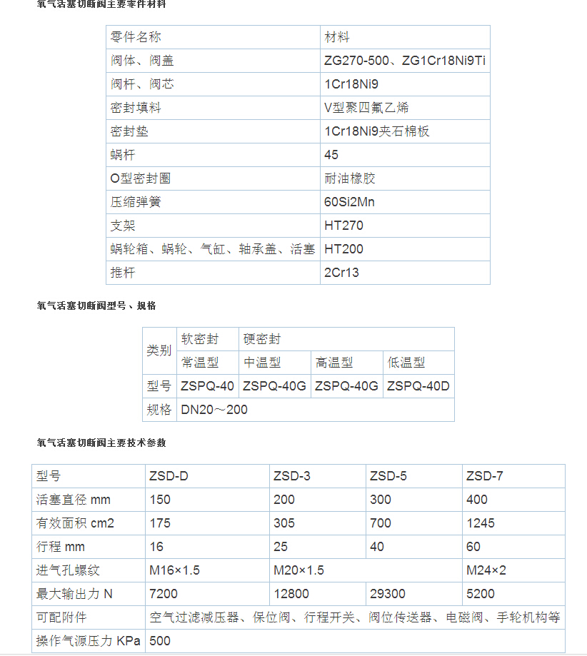 氧气活塞切断阀由切断机构与气动活塞执行机构组成。切断机构采用直通单座形成,DN20阀芯为单导向,DN25~200阀芯为双导向,具有结构简单、操作方便、使用可靠、快速开闭等特点。主要应用于无杂质、无颗粒的液体、气体介质,要求快速严密关闭,快速放空的自动控制系统中。 产品符合GB/T4213-92。